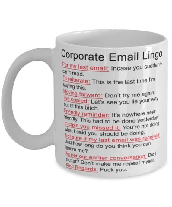 Corporate email lingo. Apr 27 2020 - Corporate Email Lingo - Per My Last Email - In Case You Suddenly Cant Read Mugs. Blank Composition Ruled LineJournal Office Coworker Gag Gift Notebook. Corporate Email Lingo Time quotes Life hacks for school Work humor.