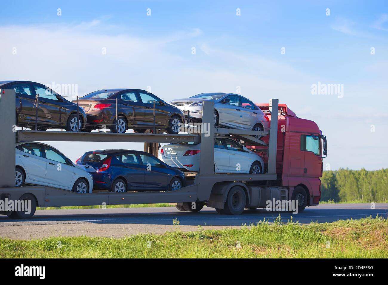 Transportation Of Car On Semi Trailer On Country Highway Stock Photo Alamy